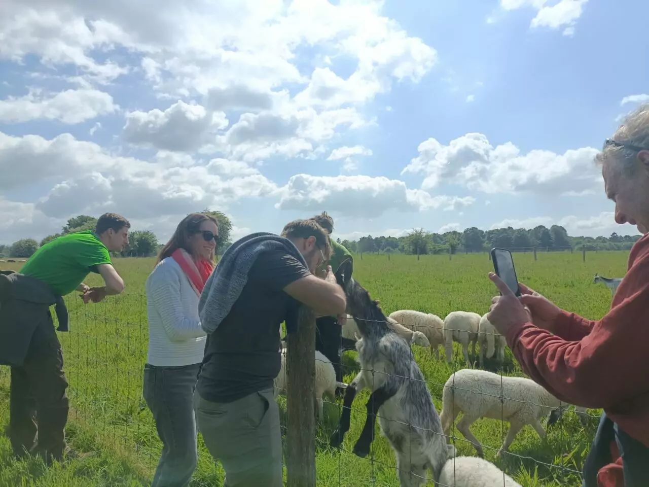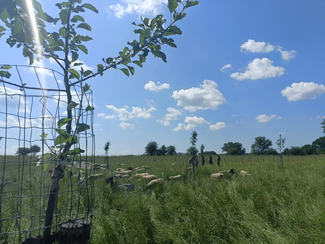 Nous avons eu le plaisir de visiter la parcelle avec les entreprises contributrices au financement du projet, et notamment Eurid. Justine et Arnaud avaient préparer un parcours de promenade pour découvrir la plantation, les troupeaux et donc toute la philosophie des projets de plantations e la Ferme de l’Espérance depuis 2021. Quel plaisir de voir les ovins et caprins déjà en pâture sous le verger planté en 2021 via PlantC.