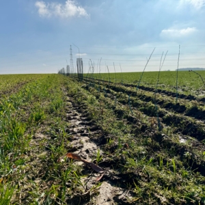 En ce qui concerne les arbres de position, le choix s’est opéré sur du chêne sessile, alisier torminal et du tilleul à petites feuilles. Ces 48 arbres sont espacés de 10m et sont tuteurés de sorte à les guidés. L’objectif ici est à terme est de valoriser ces essences en bois d’œuvre.